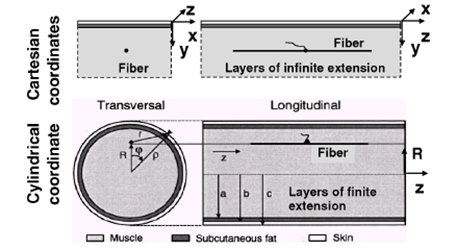 图 4:在笛卡尔坐标系和圆柱坐标系中表示肌肉纤维的位置 [2]